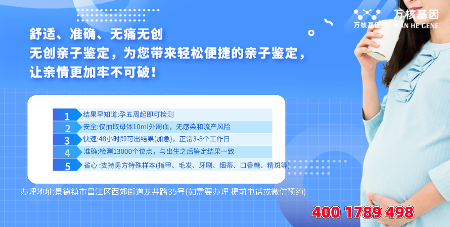 在景德镇昌江,可快速办理:落户亲子鉴定、亲子关系鉴定、亲缘关系鉴定、个体识别鉴定等等亲子鉴定,景德镇昌江落户亲子鉴定办理地址:景德镇市昌江区西郊街道龙井路35号(如需要办理 提前电话或微信预约)-预约电话:4001789498。